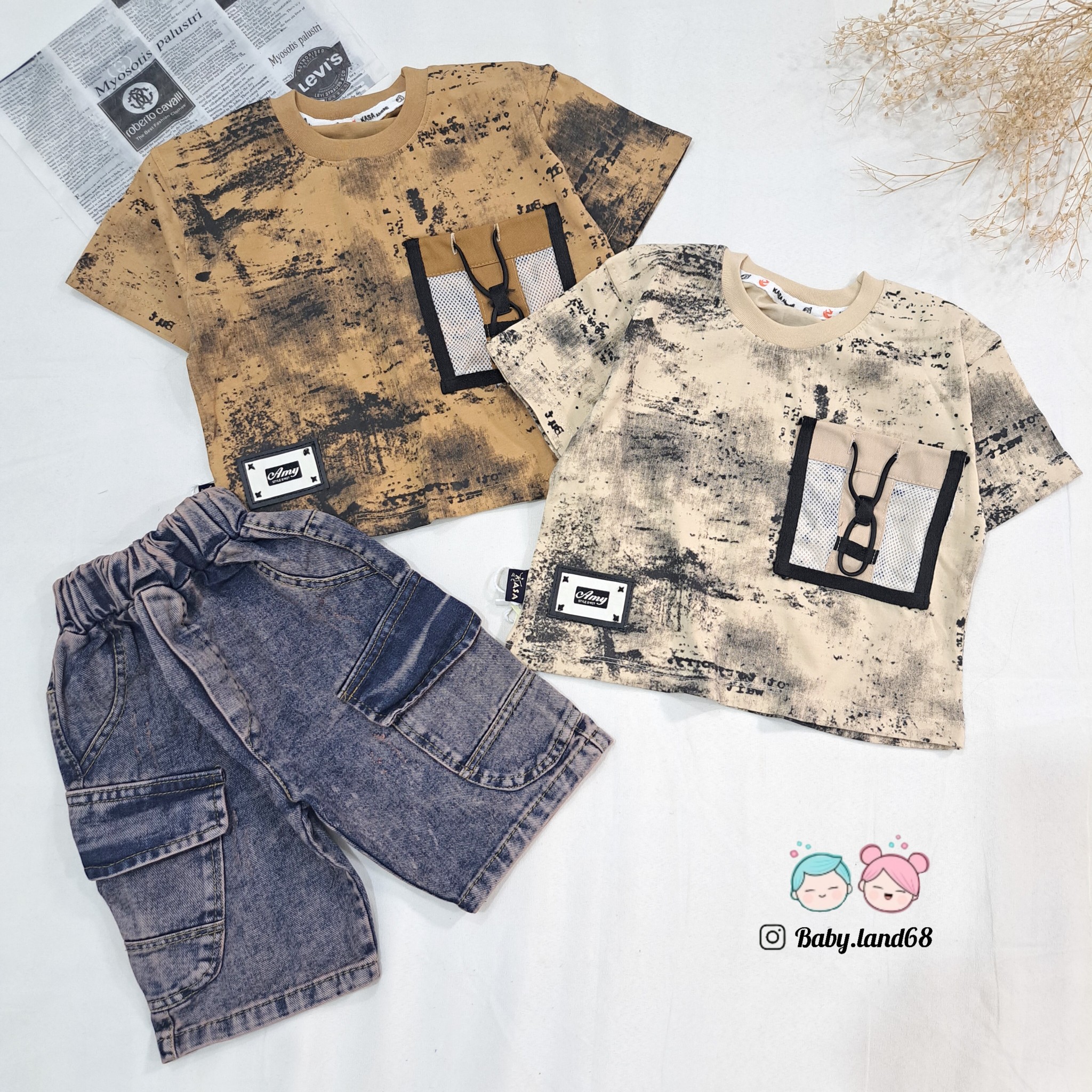 ست بیرونی تیشرت و شلوارک لی بچگانه اسپرت سایز ۳۵ تا ۵۰ مناسب ۱ تا ۷ سال جنس تیشرت پنبه و شلوارک لی درجه یک طرح ابر و بادی
