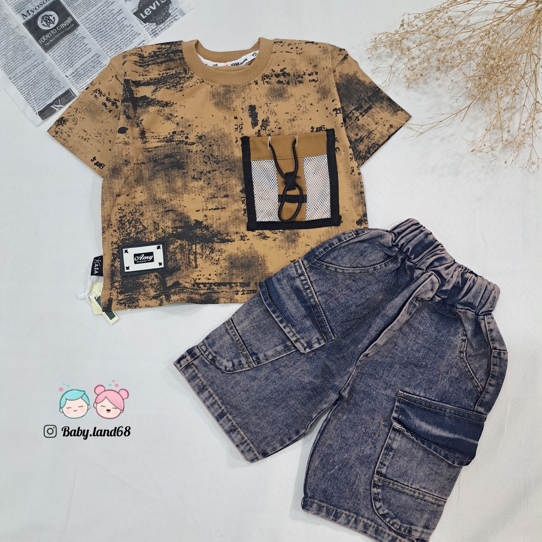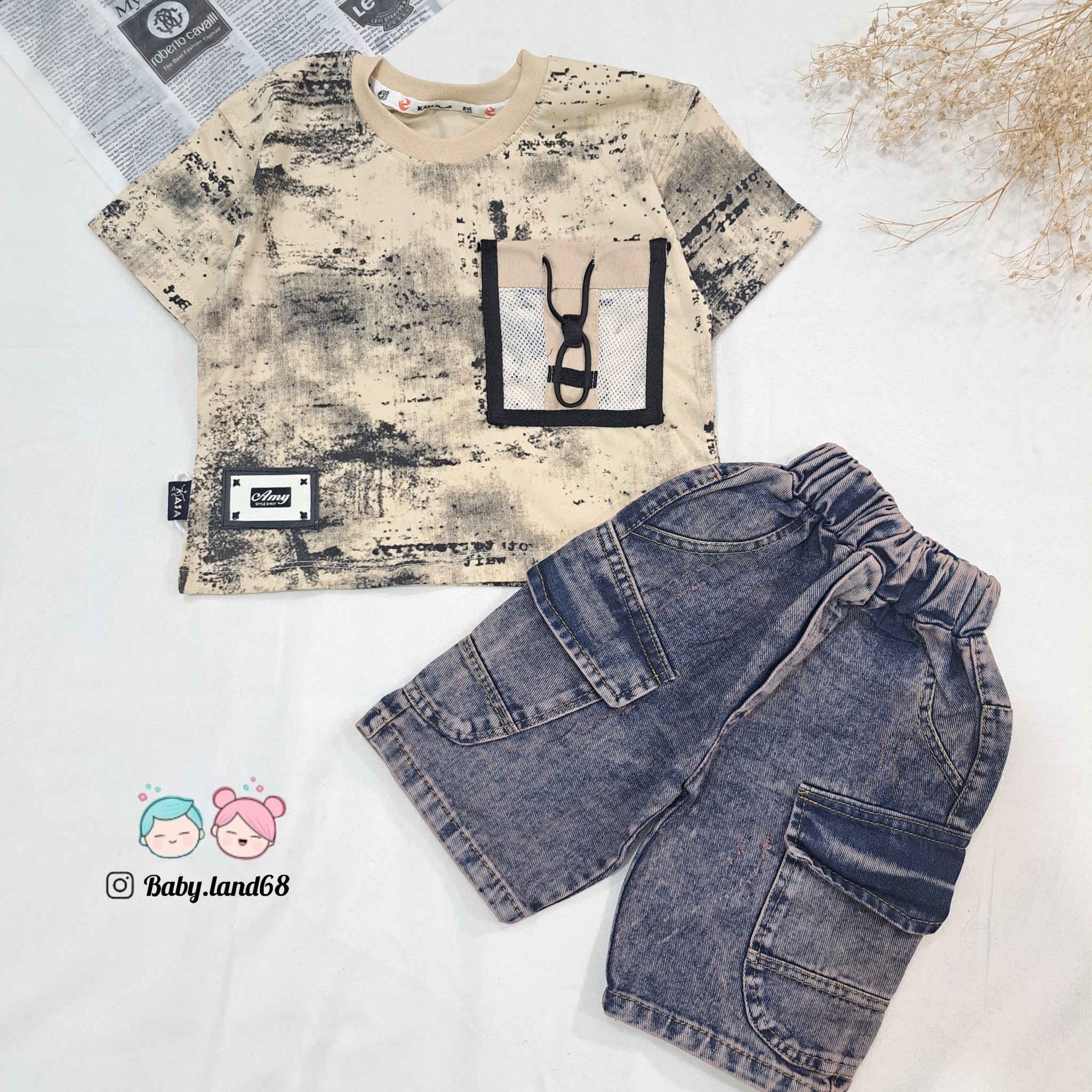 ست بیرونی تیشرت و شلوارک لی بچگانه اسپرت سایز ۳۵ تا ۵۰ مناسب ۱ تا ۷ سال جنس تیشرت پنبه و شلوارک لی درجه یک طرح ابر و بادی