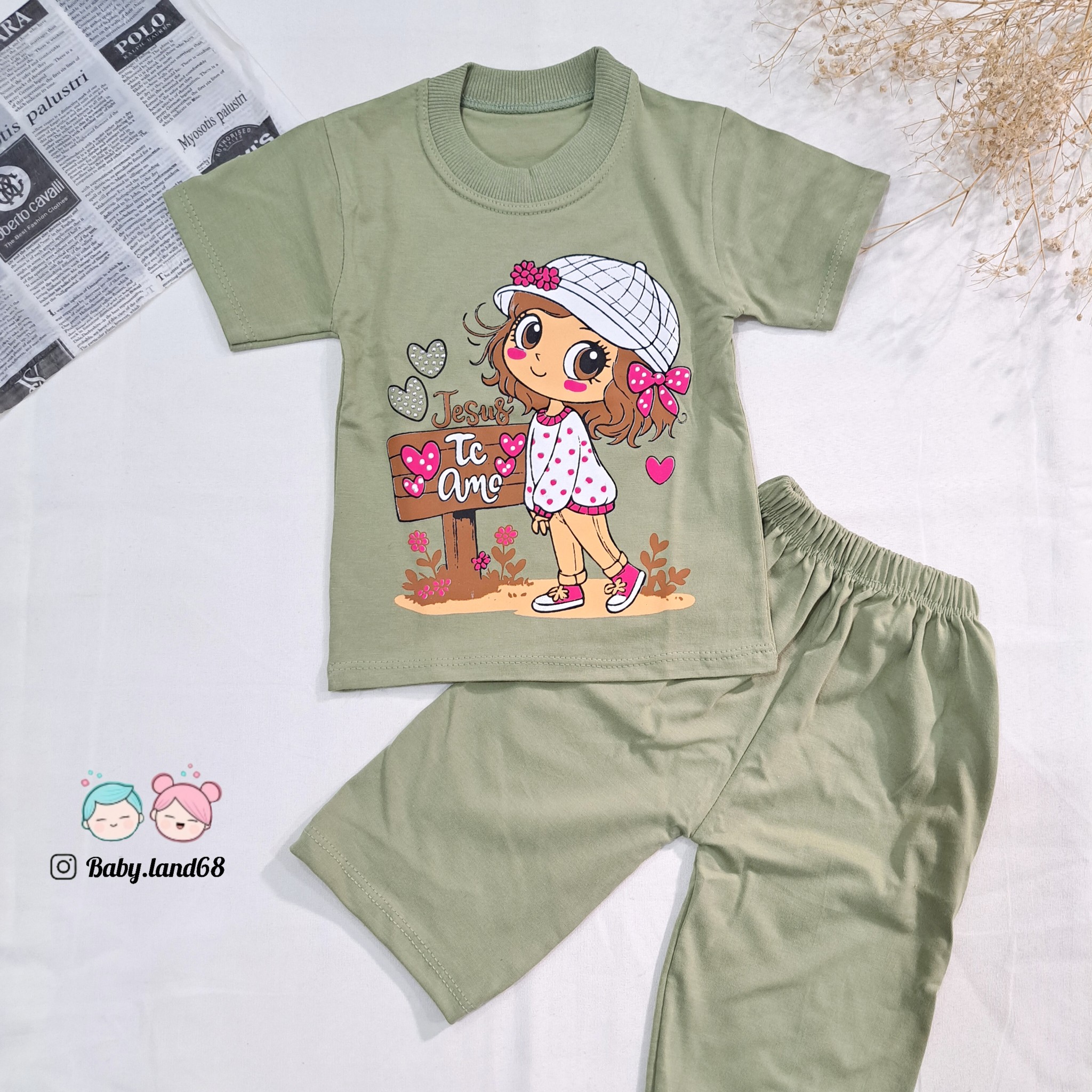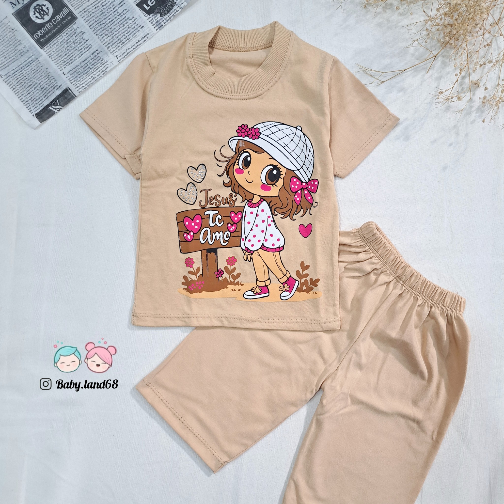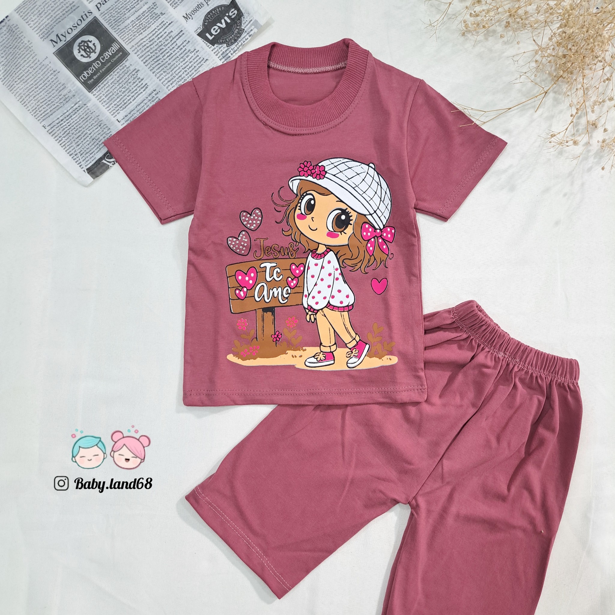 ست تیشرت و شلوارک دخترانه بچگانه ۶ ماه تا ۷ سال سایز ۳۵ تا ۵۰ جنس پنبه مناسب بهار و تابستان طرح دخترک کلاه به سر