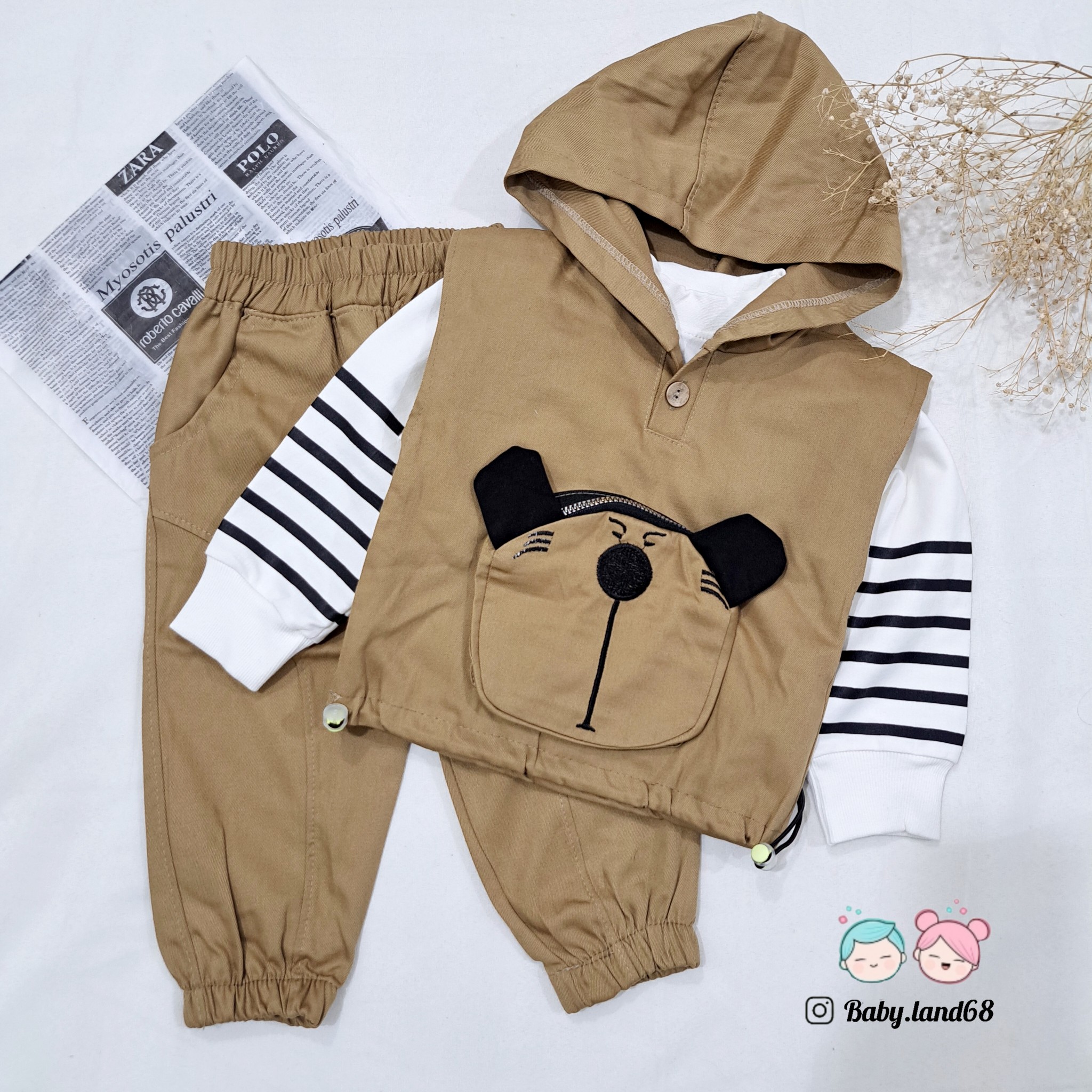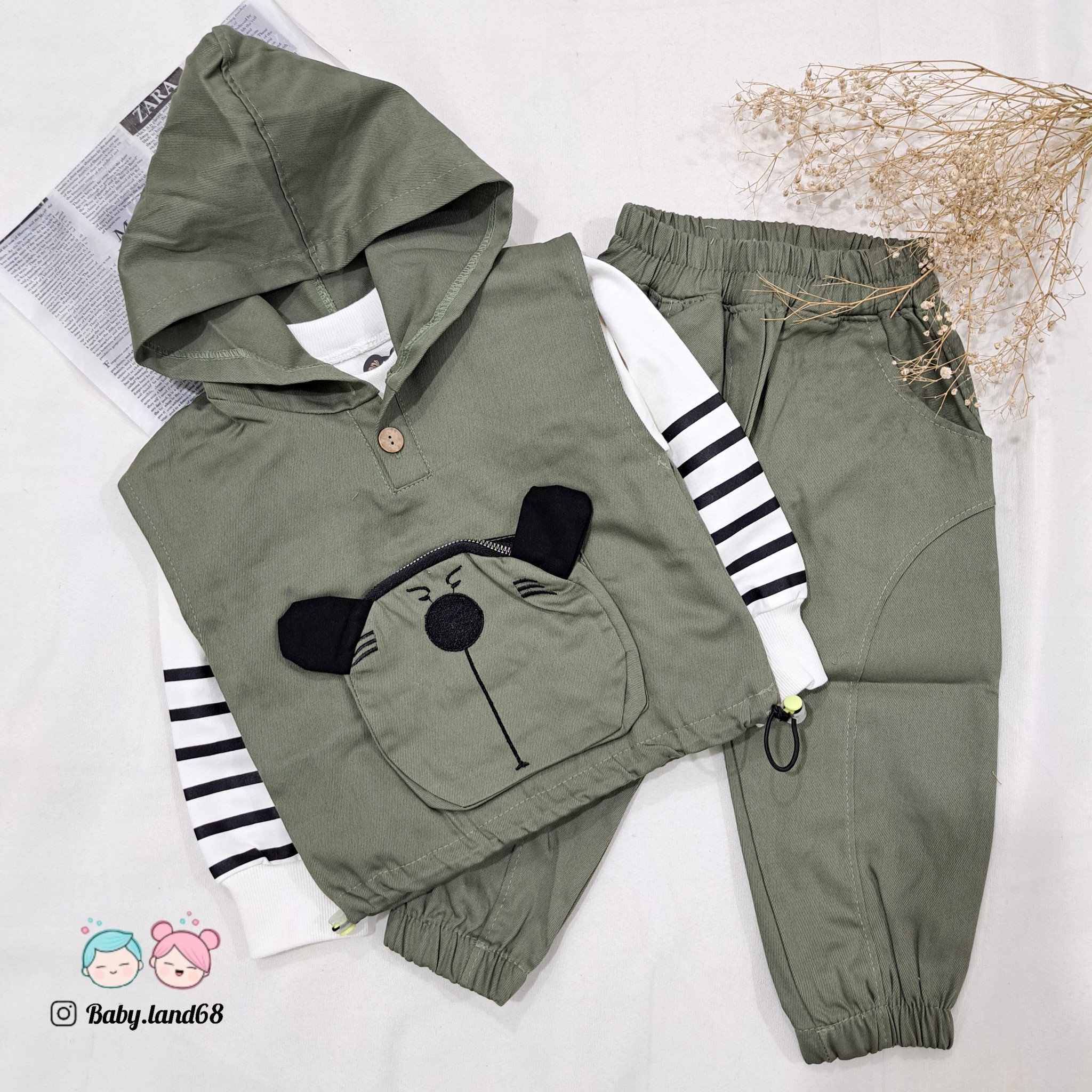 ست ۳ تیکه هودی جلیقه ای  و شلوار کتان و بلوز دورس پنبه بچگانه ۱ تا ۷ سال سایز ۳۵ تا ۵۰