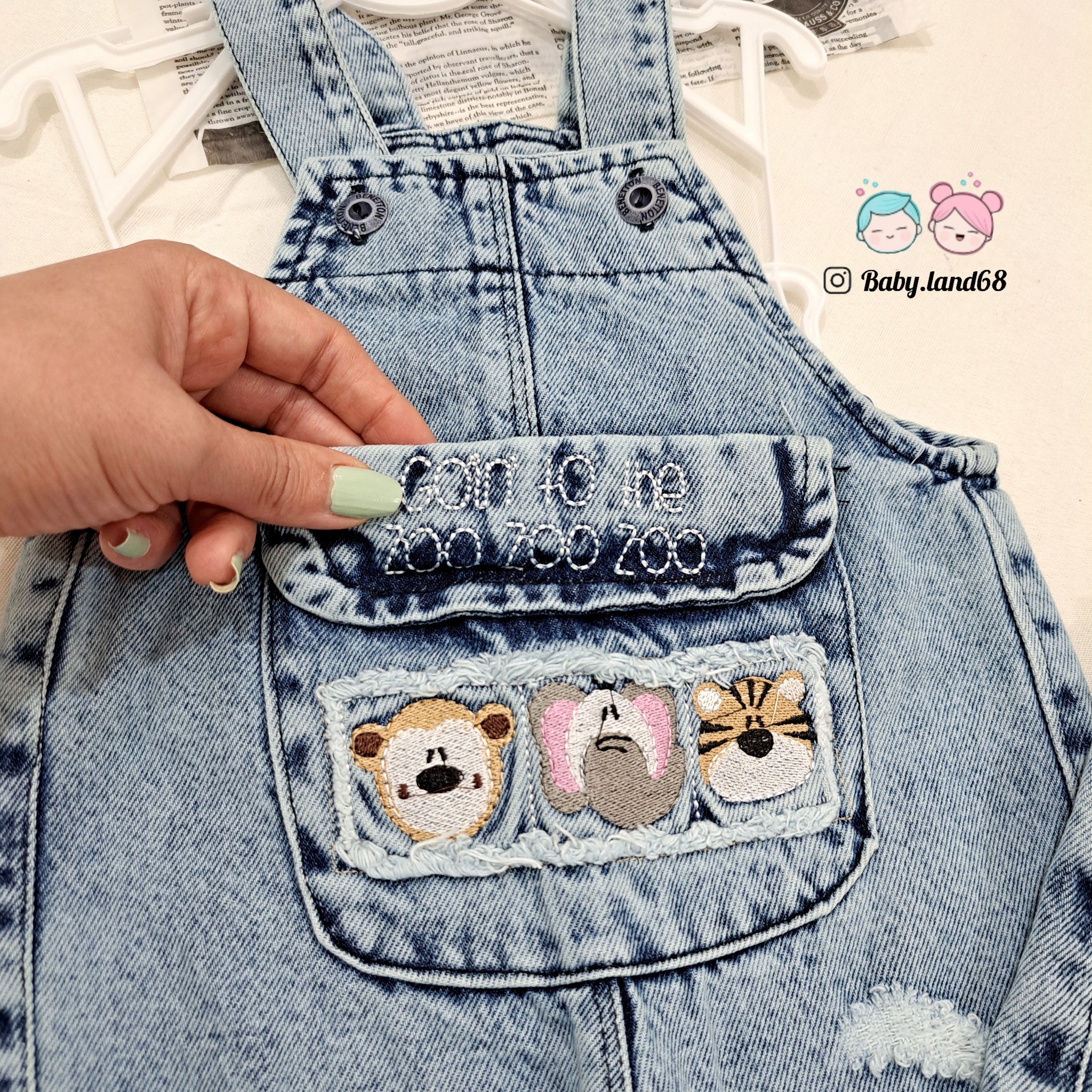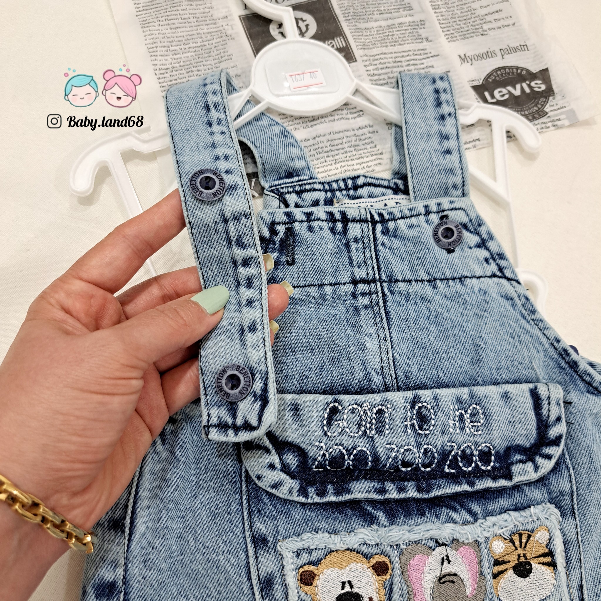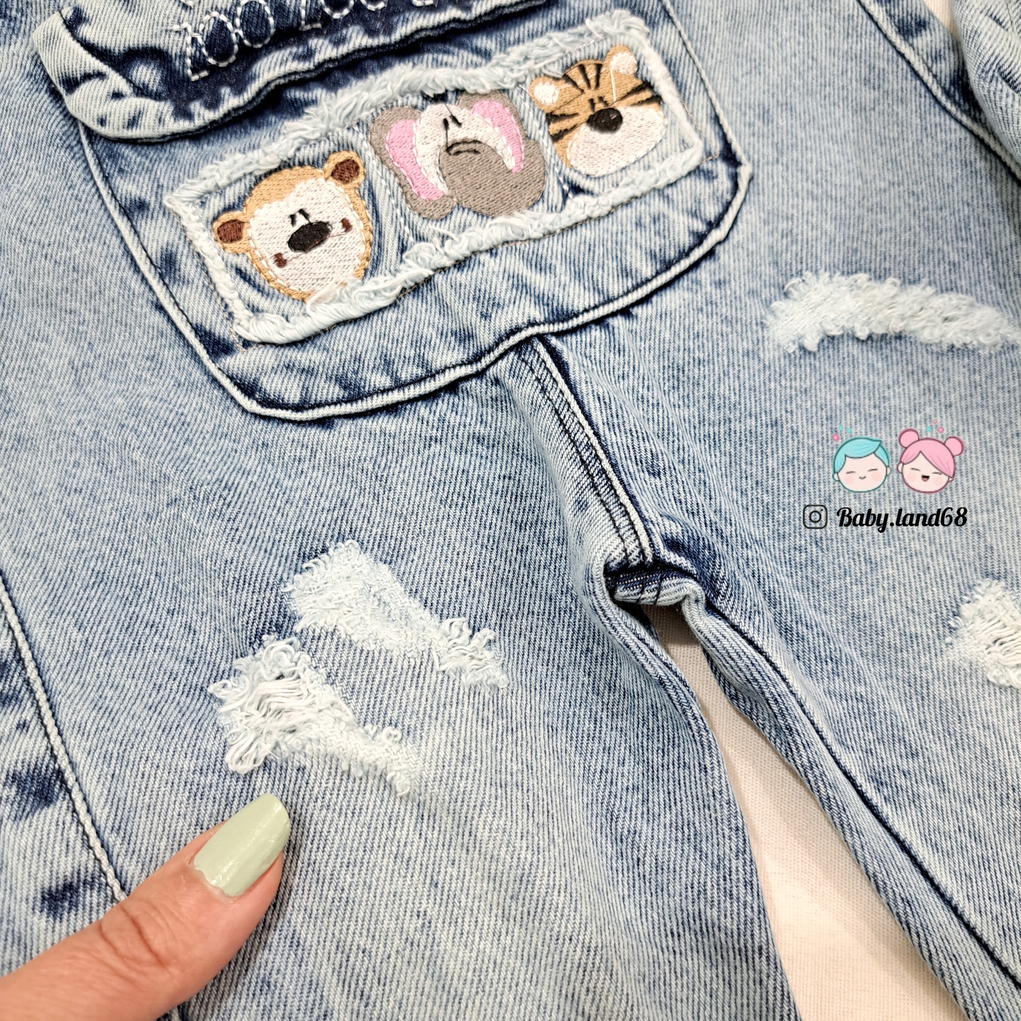 بیلر جین اسپرت بچه گانه مناسب دختر و پسر 6 ماهه تا ۳ سال طرح حیوانات  تیکه دوزی شده جنس لی گرم بالا رنگ آبی سنگشور شده